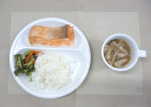 今日の給食は、「鮭の塩焼き」、「ブロッコリーとひじきのソテー」と「豚汁」
