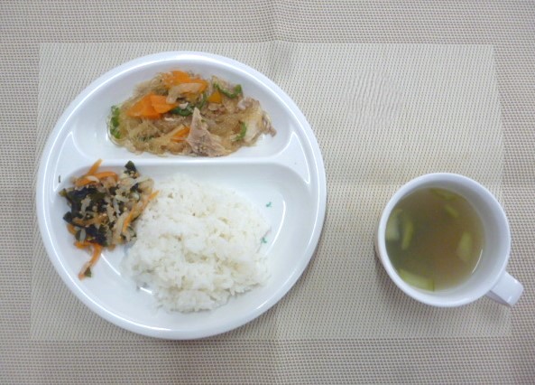今日の給食は、「チャプチェ」、「もやしとわかめのごま酢和え」と「中華スープ」 おやつは、「牛乳」、「パイン缶」と「おにぎりせんべい」です。