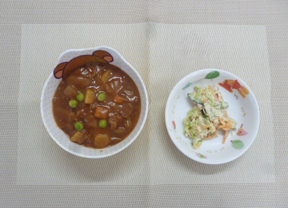 今日の給食は、「カレーライス」と「キャベツとツナのサラダ」