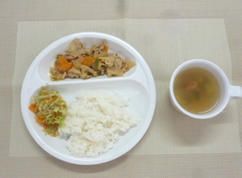 今日の給食は、「豚肉のカレーソテー」、「キャベツサラダ」と「夏野菜スープ」