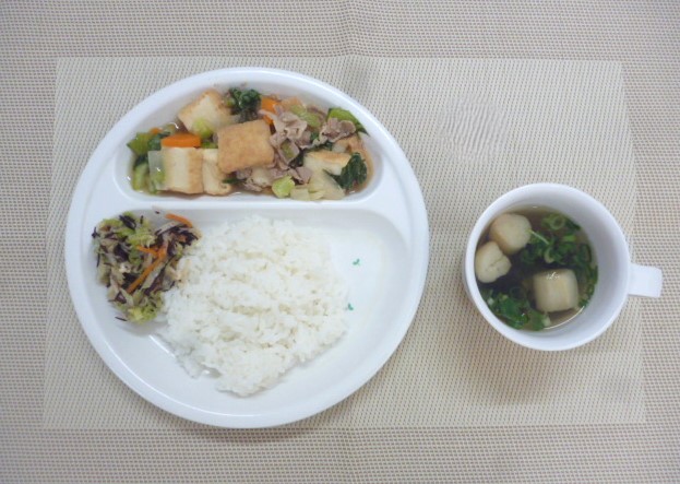 令和6年7月3日(水)の献立 2024/07/03 今日の給食は、「厚揚げチャンプルー」、「キャベツとひじきのナムル」と「麩のすまし汁」 おやつは、「牛乳」、「きなこ蒸しパン」と「ハッピーターン」です。