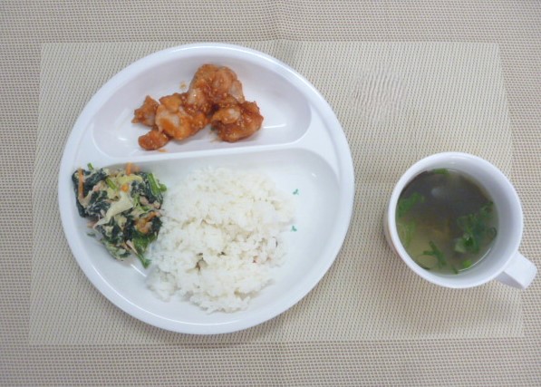 今日の給食は、「ヤンニョム風チキン」、「ほうれん草とツナのサラダ」と「じゃが芋のスープ」