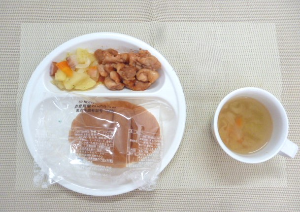 今日の給食は、「ロールパン」、「BBQチキン」、「ジャーマンポテト」と「コンソメスープ」