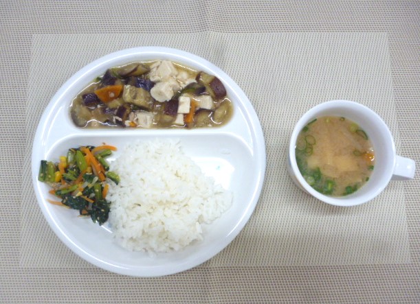 今日の給食は、「豆腐となすのそぼろ煮」、「小松菜のごま和え」と「切干大根のみそ汁」 おやつは、「牛乳」、「すいか」と「新潟仕込み」です。