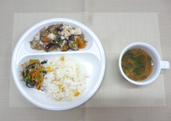 今日の給食は、「焼きもろこしごはん」、「豆腐となすのそぼろ煮」、「小松菜のごま和え」と