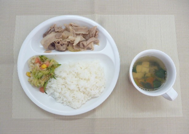今日の給食は、「十和田バラ焼き」、「キャベツとトマトのサラダ」と「ほうれん草のすまし汁」