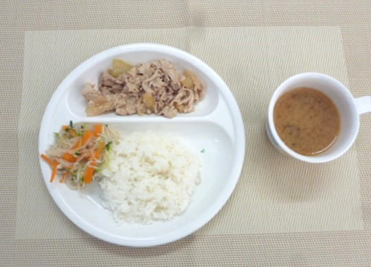 今日の給食は、「豚肉のしょうが焼き」、「大根と豆苗のじゃこサラダ」と「厚揚げのみそ汁」
