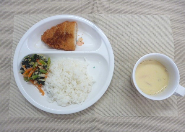 令和6年10月1日(火)の献立 2024/10/01 今日はお誕生日会です🍰✨ 10月生まれのお友達、お誕生日おめでとう🎃 今日の給食は、「白身魚フライ」、「小松菜の和風サラダ」と「野菜コーンスープ」 おやつは、「牛乳」と「りんごケーキ」です。