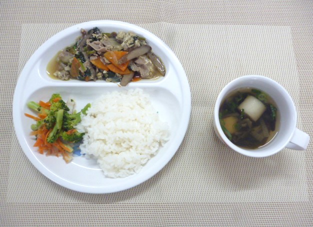 今日の給食は、「豚肉の柳川風煮物」、「ブロッコリーのおかか和え」と「麩のすまし汁」 おやつは、「牛乳」、「黒糖蒸しパン」と「動物ビスケット」です。