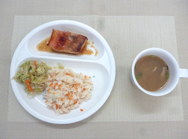 令和6年10月11日(金)の献立 2024/10/11 今日の給食は、「もみじごはん」、「赤魚の煮つけ」、「キャベツの磯和え」と「なすのみそ汁」 おやつは、「牛乳」、「りんご」と「ホームパイ」です。 ★「さわらの塩焼き」は、「赤魚の煮つけ」に変更となりました。 ★おやつの「ウエハース」は、「ホームパイ」に変更となりました。