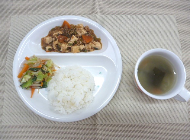 令和6年10月23日(水)の献立 2024/10/23 今日は2回目の運動会の予行練習です! 雨で練習できるか分からなかったですが、開始時間になると太陽が☀ 蒸し暑い中、みんなよく頑張っていました😊 本番も頑張ってね🚩 今日の給食は、「麻婆豆腐」、「チンゲン菜のナムル」と「わかめスープ」 おやつは、「牛乳」、「フルーツヨーグルト」と「新潟仕込み」です。