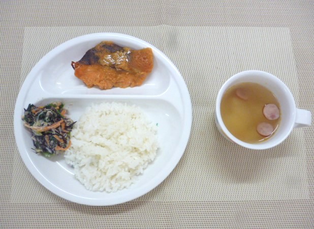 令和6年11月1日(金)の献立 2024/11/01 今日はお誕生日会です🍰✨ 11月生まれのお友達、お誕生日おめでとう🍂 今日の給食は、「鮭のタンドリー焼き」、「ほうれん草とひじきのサラダ」と「ポトフ風スープ」 おやつは、「牛乳」、「ココアミルクゼリー」と「クラッカー」です。 ★「鮭のタンドリー焼き」は新メニューです🍴