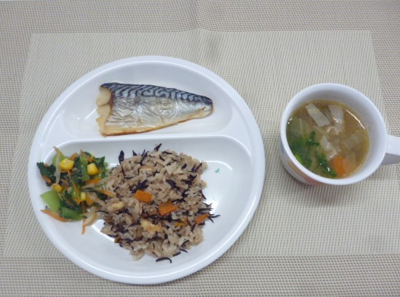 今日の給食は、「ひじきごはん」、「さばの塩焼き」、「小松菜のごま和え」と「白菜のみそ汁」 おやつは、「牛乳」、「豆乳あべかわ」と「こんぶ」です。