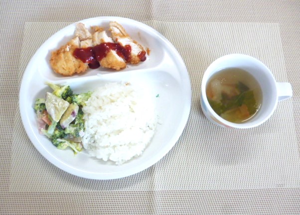 令和6年12月3日(火)の献立 2024/12/03 今日はお誕生日会です🍰✨ 12月生まれのお友達、お誕生日おめでとう🎁 今日の給食は、「チキンカツ」、「蒸し野菜のサラダ」と「かぶのスープ」 おやつは、「牛乳」と「チーズケーキ」です。