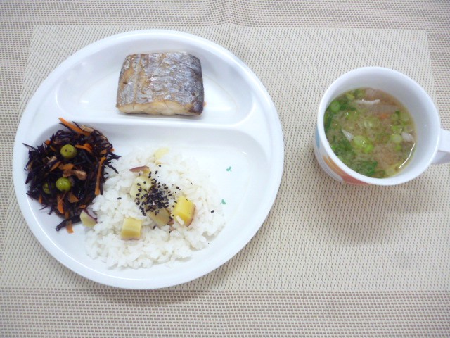 令和6年12月6日(金)の献立 2024/12/06 今日の給食は、「さつま芋ごはん」、「太刀魚の塩焼き」、「ひじきの炒め煮」と「豚汁」 おやつは、「牛乳」、「みかん」と「ぼんち揚げ」です。 ★「さわらの塩焼き」は、「太刀魚の塩焼き」に変更となりました🐟