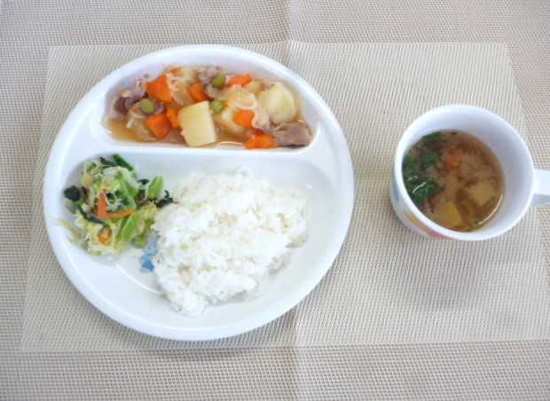 今日の給食は、「肉じゃが」、「小松菜の塩ごま和え」と「厚揚げのみそ汁」 おやつは、「牛乳」、「バナナ」と「新潟仕込み」です。