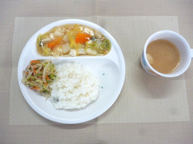 今日の給食は、「豆腐と白菜の旨煮」、「もやしのごま和え」と「里芋のみそ汁」