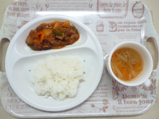 今日の給食は、「牛肉と野菜のケチャップ煮」と「コンソメスープ」