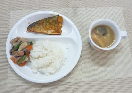 今日の給食は、「さばのカレー焼き」、「根菜と鶏肉の煮物」と「小松菜のみそ汁」 おやつは、「牛乳」、「りんご」と「芋けんぴ」です。