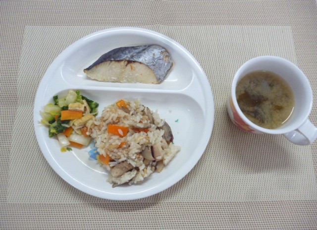 今日の給食は、「鶏ごぼうごはん」、「さわらの塩焼き」、「白菜と油揚げの煮浸し」と「麩のみそ汁」