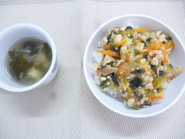 今日の給食は、「あんかけチャーハン」と「中華スープ」 おやつは、「牛乳」と「お楽しみおやつ」です。