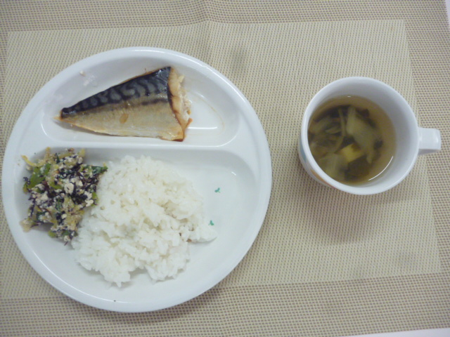給食は「さばの煮付け」と「小松菜と豆腐のごま和え」と「じゃがいものすまし汁」