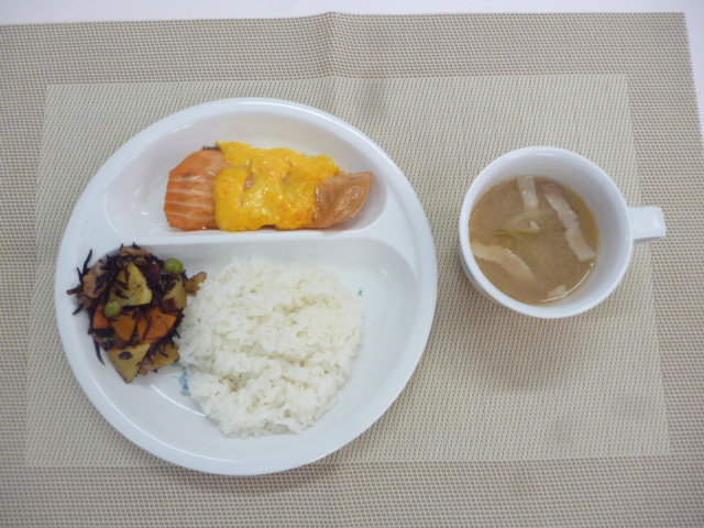 今日の給食は「鮭のにんじん衣焼き」と「ひじきとさつま芋の炒め煮」と「春野菜のみそ汁」