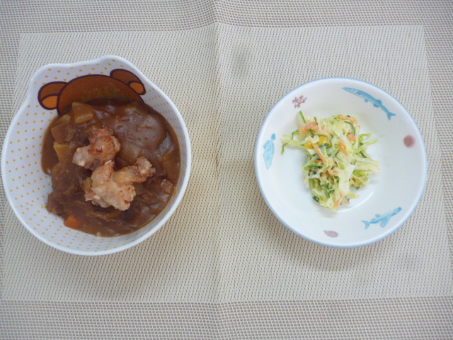 今日の給食は「からあげカレー」と「コールスローサラダ」