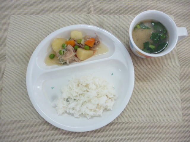 今日の給食は「肉じゃが」と「小松菜のみそ汁」