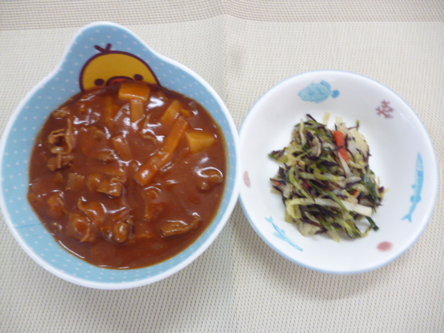 今日の給食は「ハヤシライス」と「まっくろくろすけサラダ」
