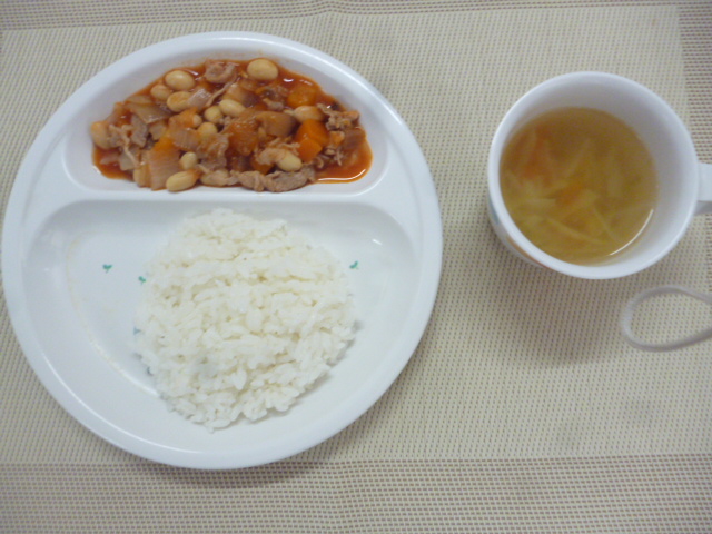 今日の給食は「ごはん」と「ポークビーンズ」と「野菜スープ」