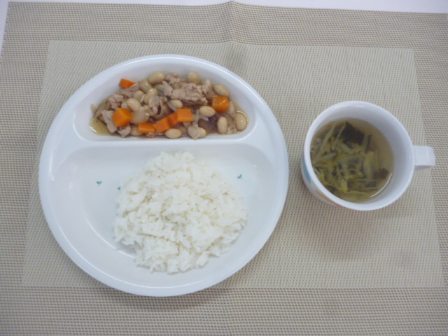 今日の給食は「五目大豆煮」「味噌汁」と「ごはん」です。