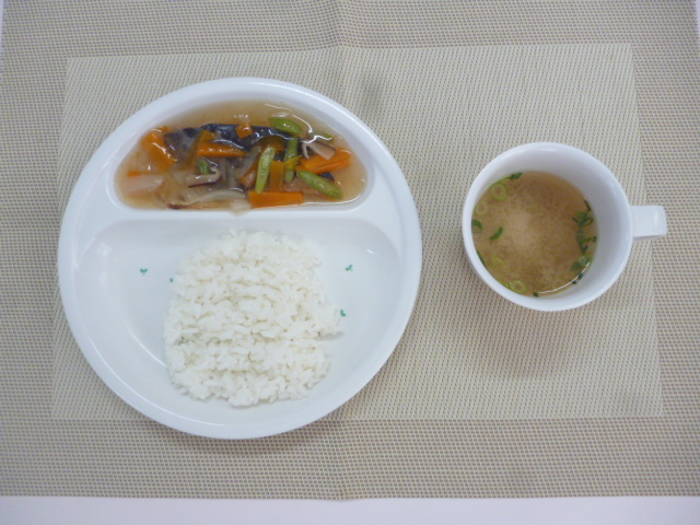 今日の給食は「魚の野菜あんかけ」「豆腐の味噌汁」と「ごはん」です。