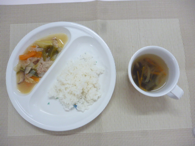 今日の給食は「ごはん」と「八宝菜」と「玉葱とわかめのスープ」