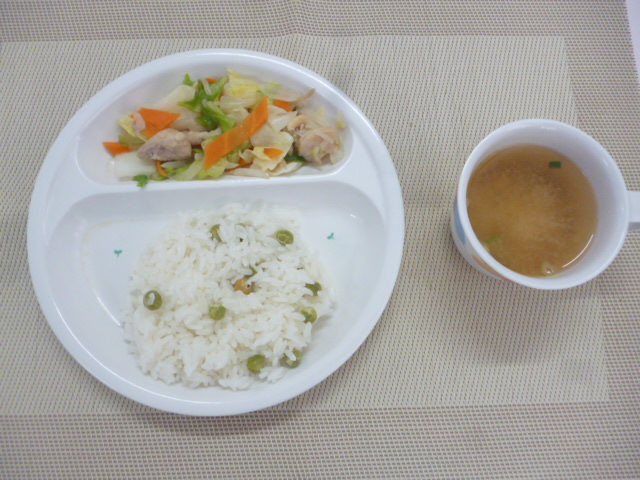 今日の給食は「えんどうごはん」と「鶏肉の野菜炒め」と「味噌汁」
