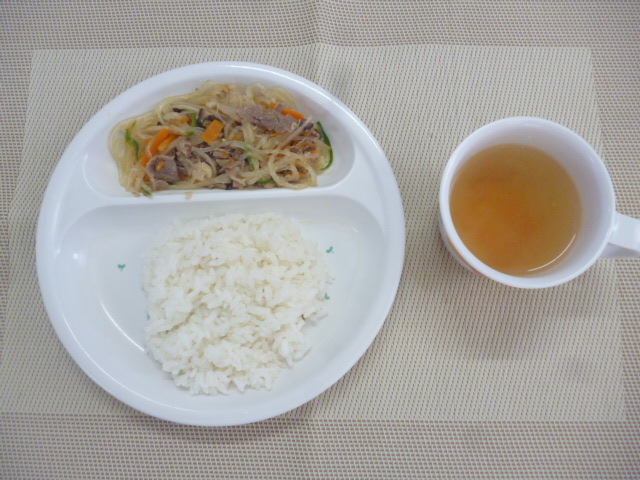 今日の給食は「チャプチェ」「野菜のスープ」と「ごはん」です。