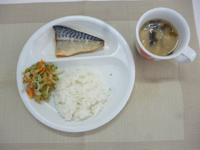 今日の給食は「鯖の生姜煮」「ごま和え」「味噌汁」と「ご飯」です。