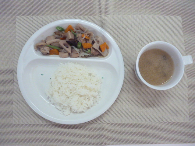 今日の給食は「筑前煮」「豆腐の味噌汁」「ごはん」です。 おやつは「はとむぎおこし」「粉ふき芋(青のり)」「牛乳」です。