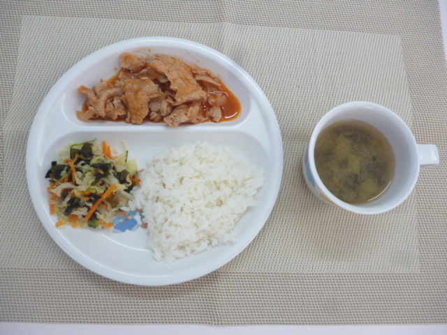 今日の給食は「ごはん」「豚肉のノルウェー風」「酢の物」「味噌汁」です。 おやつは「新潟仕込み」「メロン」です。