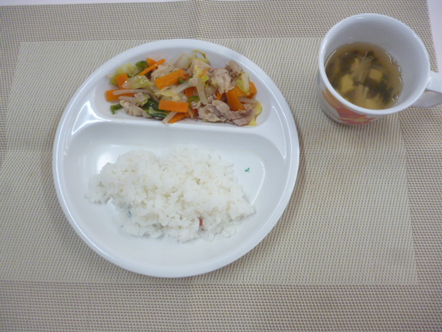 本日の給食は、「豚肉と野菜のみそ炒め」、「わかめときのこのすまし汁」と「ごはん」 おやつは、「牛乳」と「お楽しみおやつ」です。