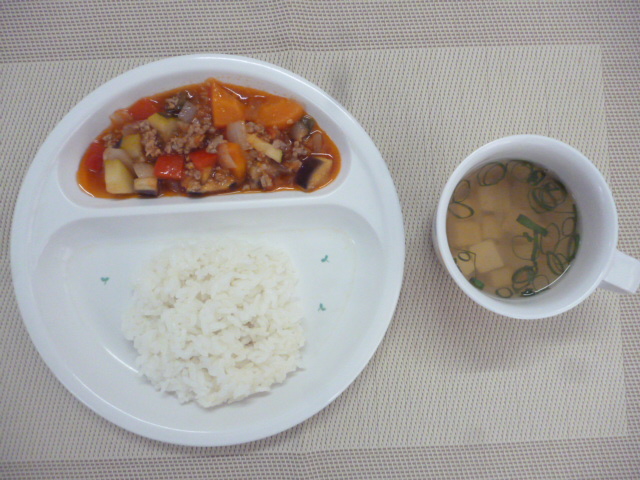 今日の給食は「ごはん」と「ラタトゥイユ風ミート」と「豆腐と玉ねぎのスープ」