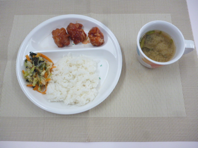 本日の給食は、「豚肉のノルウェー風」、「酢の物」、「味噌汁」と「ごはん」 おやつは、「ほしたべよ」、「甘夏缶」と「牛乳」です。