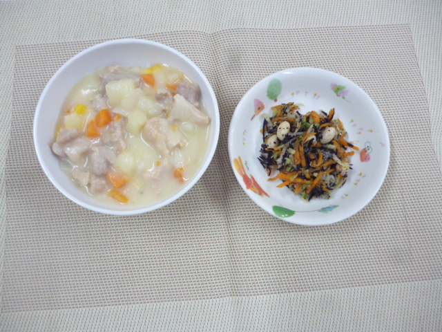 本日の給食は、「コーンシチュー」、「大豆とひじきのサラダ」と「ごはん」 おやつは、「牛乳」、「ゼリー」と「いもけんぴ」です。