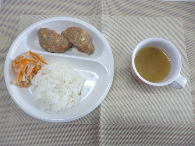 今日の給食は「ごはん」と「鯖缶さつま揚げ」と「もやしのお浸しと「味噌汁」