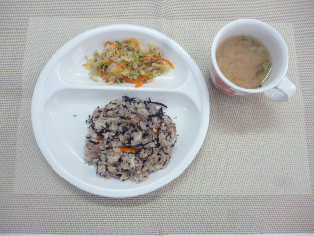 今日の給食は「ひじきごはん」と「キャベツのおかか和え」と「味噌汁」