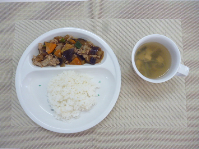 今日の給食は「ごはん」「茄子の味噌煮」「わかめと豆腐のすまし汁」です。