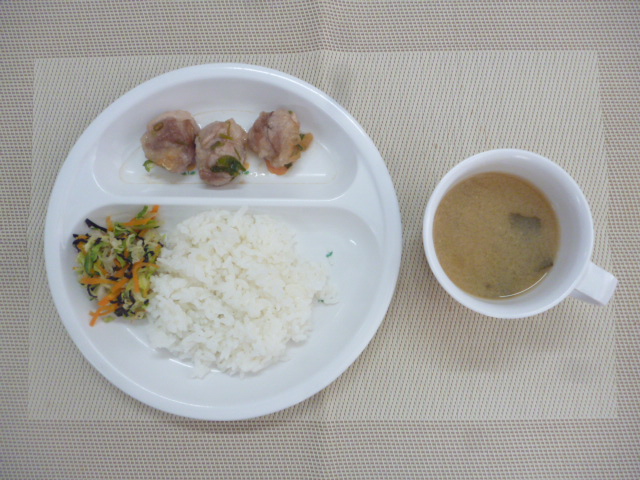 今日の給食は「ごはん」と「豚肉の南蛮漬け」と「キャベツの磯部揚げ」と「味噌汁」