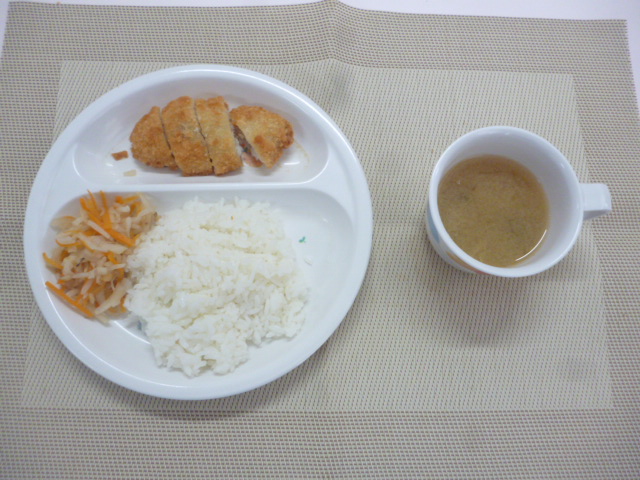 今日の給食は「ごはん」と「白身フライ」と「もやしのお浸し」と「味噌汁」