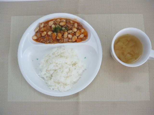 今日の給食は「ごはん」「チリコンカーン」「野菜スープ」です。