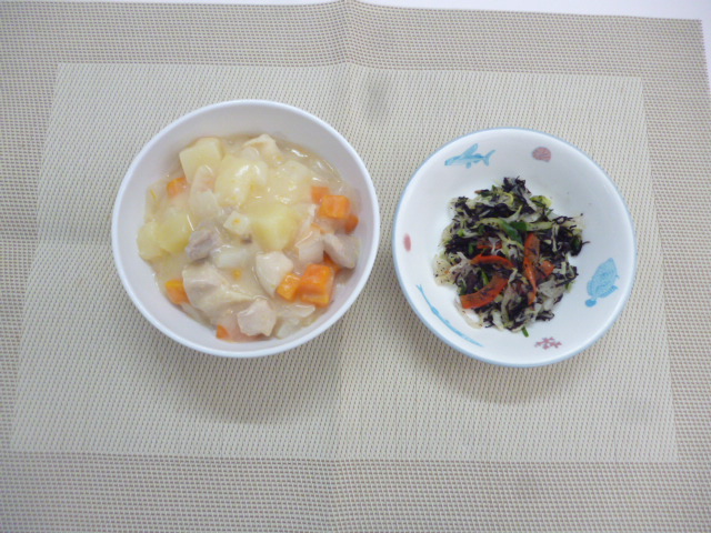 今日の給食は「ごはん」と「クリームシチュー」と「まっくろくろすけサラダ」